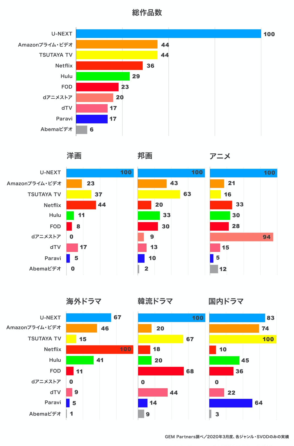 U-NEXTの総作品数はAmazonプライムビデオ、TSUTAYA TV、Netflixの2倍以上で、ぶっちぎりの1位です。