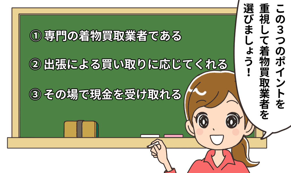 着物買い取り業者を選ぶにあたり、とくに大事なのは下記の3点です。